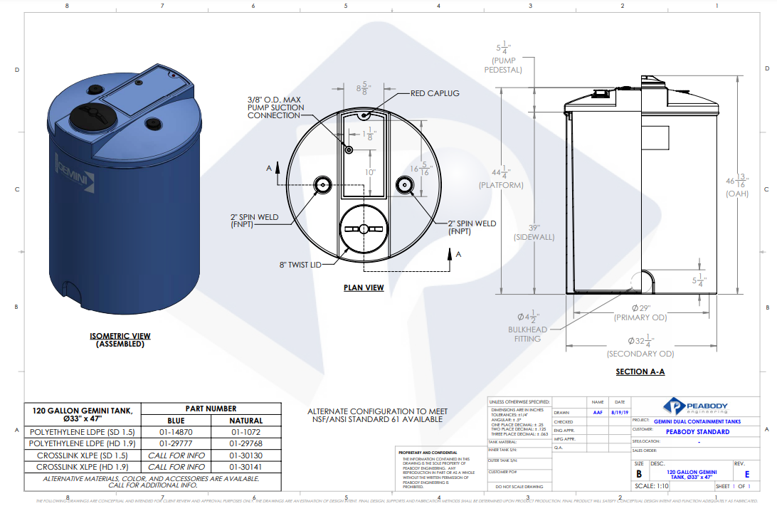 The Peabody 120 Gallon Blue Heavy Duty Double Wall Tank (Part# 29777) is an industrial-grade chemical containment tank, designed for safe and compliant storage in commercial and industrial applications. With a double-wall containment system, this tank provides 110% to 120% secondary containment, ensuring compliance with EPA 49 CFR regulations for spill prevention and environmental protection.