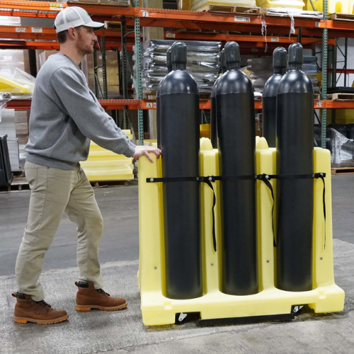 Compatible with the 7202-YE 6-Cylinder Storage Rack, this wheeled caster frame improves workflow efficiency and enhances safety by allowing smooth and controlled transport of cylinders.