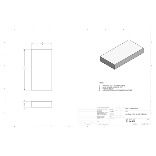 The Custom Roto-Mold 44 Gallon Marine Water Tank (Part# MW-485) is engineered for mobile potable water storage in marine, RV, trailer, and off-grid systems where a low-profile footprint is essential. Its 7.5" height allows for easy integration into shallow compartments, underfloor mounts, or deck spaces, without sacrificing storage capacity.