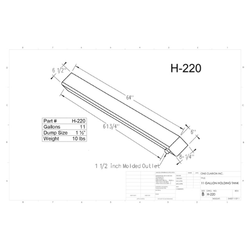 The Custom Roto-Mold 11 Gallon RV Holding Tank (Part No. H-220) is a slim, low-capacity solution designed for compact mobile applications such as RVs, travel trailers, food trucks, and van conversions. Its long and narrow form factor allows installation in tight or shallow spaces, making it ideal for underfloor mounting or within cabinetry.
