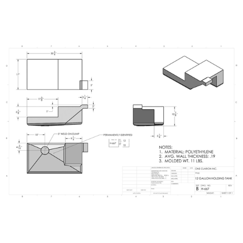 The Custom Roto-Mold 12 Gallon RV Holding Tank (Part# H-667) is engineered to meet the demands of mobile holding storage applications, including RVs, trailers, campers, food trucks, and off-grid systems. Its compact and versatile design makes it an excellent solution for auxiliary tanks or installations with limited space.