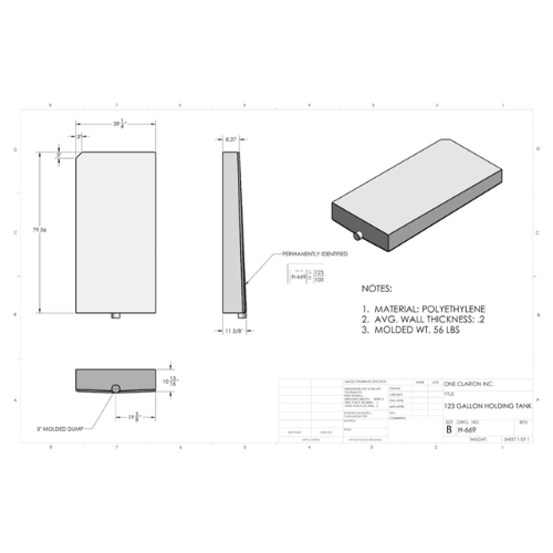 The Custom Roto-Mold 123 Gallon RV Holding Tank (Part# H-669) is engineered to meet the demands of mobile holding storage applications, including RVs, trailers, campers, food trucks, and off-grid systems. With its high-capacity design and wide, low-profile footprint, this tank is an ideal solution for large-scale water or waste storage needs where vertical clearance is limited.
