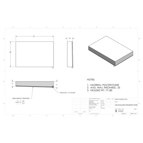 The Custom Roto-Mold 136 Gallon RV Holding Tank (Part# H-673) is engineered to meet the demands of mobile holding storage applications, including RVs, trailers, campers, food trucks, and off-grid systems. Its large, low-profile design is perfect for high-capacity water or waste storage in wide, shallow compartments.