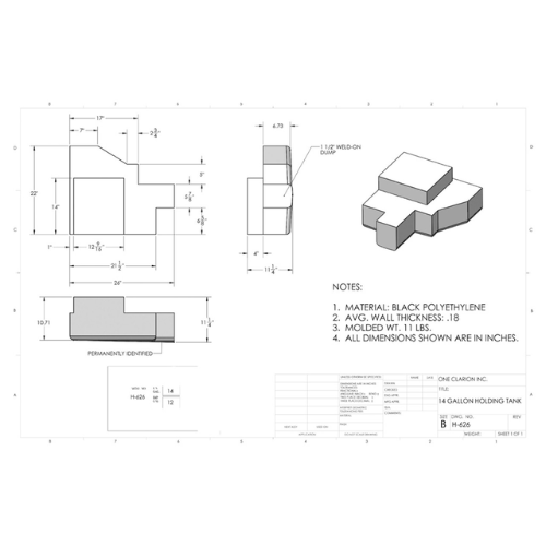 The Custom Roto-Mold 14 Gallon RV Holding Tank (Part# H-626) is engineered to meet the requirements of mobile holding storage applications, including RVs, trailers, food trucks, campers, and off-grid systems. With its compact footprint and versatile shape, this tank is ideal for tight spaces, auxiliary systems, or smaller-scale installations.