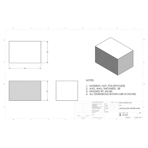 The Custom Roto-Mold 145 Gallon RV Water Tank (Part# W-527) is expertly crafted to meet the demands of high-capacity potable water storage in mobile environments. Manufactured using rotationally molded polyethylene resin, this tank provides both strength and reliability for extended use on the road.