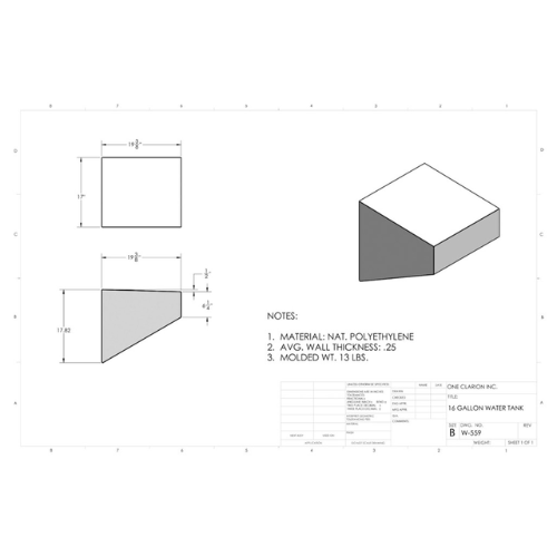 The Custom Roto-Mold 16 Gallon RV Water Tank (Part# W-559) is engineered to meet the needs of compact potable water storage in mobile living environments. Built from rotationally molded polyethylene resin, this tank delivers rugged strength, long-lasting reliability, and safe drinking water performance in space-constrained installations.