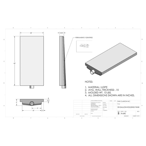The Custom Roto-Mold 18 Gallon RV Holding Tank (Part# H-640) is engineered to meet the requirements of compact mobile holding storage applications, including RVs, trailers, sprinter vans, food trucks, and off-grid setups. Its low-profile design and narrow footprint make it ideal for tight installation spaces where height is a constraint.