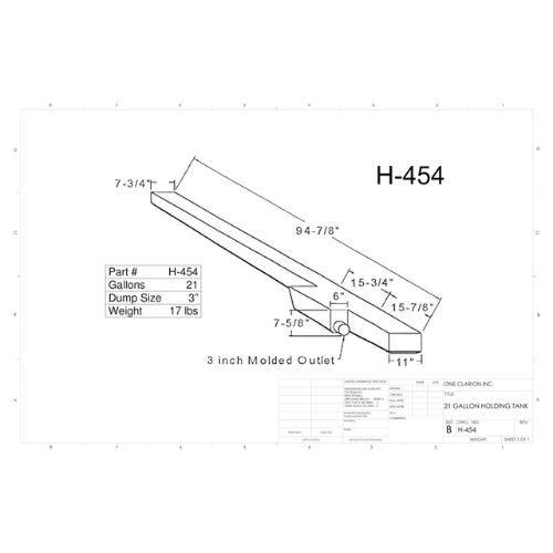 The Custom Roto-Mold 21 Gallon RV Holding Tank (Part# H-454) is designed to provide reliable liquid storage for RVs, travel trailers, and mobile systems requiring a long, slim profile. Its extended length and low height make it suitable for under-chassis mounting or narrow installation zones.