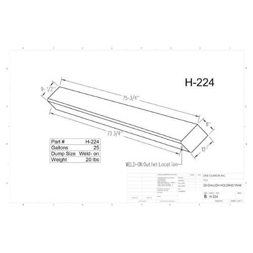 The Custom Roto-Mold 25 Gallon RV Holding Tank (Part No. H-224 [OR]) provides a compact, elongated design for efficient installation in RVs, trailers, and other mobile storage applications. With its narrow width and low height, this tank is ideal for under-floor compartments or confined spaces requiring a slim yet reliable holding solution.