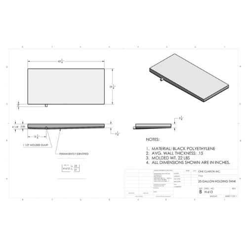 The Custom Roto-Mold 25 Gallon RV Holding Tank (Part# H-613) is engineered to meet the demands of mobile holding storage applications, including RVs, trailers, food trucks, and off-grid systems. This tank features a wide, low-profile design, making it ideal for installations requiring minimal height but greater surface area.