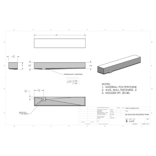 The Custom Roto-Mold 26 Gallon RV Holding Tank (Part# H-679) is engineered to meet the demands of mobile holding storage applications, including RVs, trailers, campers, food trucks, and off-grid systems. Its long and narrow design is ideal for installations where width and height are limited, but extended length is available.