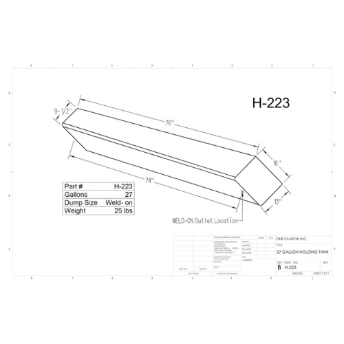 The Custom Roto-Mold 27 Gallon RV Holding Tank (Part No. H-223) is built to deliver reliable performance in mobile environments, including RVs, trailers, food trucks, and marine vehicles. With its elongated and narrow profile, it fits easily in compact spaces while providing ample liquid storage capacity.