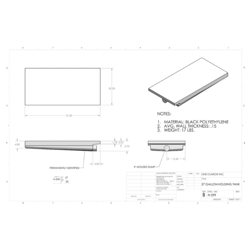 The Custom Roto-Mold 27 Gallon RV Holding Tank (Part# H-599) is engineered to meet the requirements of mobile holding storage systems, making it ideal for RVs, food trucks, camper vans, and tiny homes requiring dependable containment for potable water or waste.