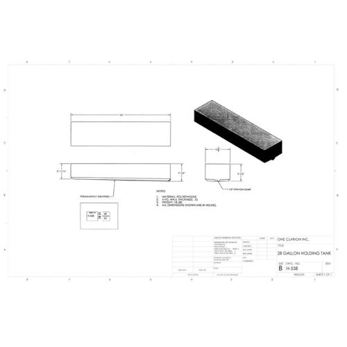 The Custom Roto-Mold 28 Gallon RV Holding Tank (Part# H-558) is designed to provide dependable, compact waste or water storage for a variety of RV and mobile applications. Its narrow profile makes it perfect for installations where space is limited or access is tight.