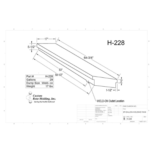 The Custom Roto-Mold 29 Gallon RV Holding Tank (Part No. H-228) is purpose-built for compact, durable mobile water and waste storage. Its low-profile, elongated design makes it ideal for shallow compartments, undercarriage installs, or tight spaces in RVs, campers, and specialty vehicles.