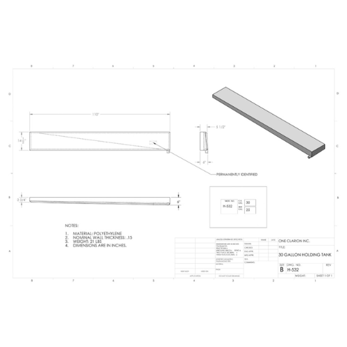 The Custom Roto-Mold 30 Gallon RV Holding Tank (Part# H-532) is expertly designed for mobile holding tank systems in RVs, trailers, campers, and portable sanitation units, especially where a long and low-profile layout is required.