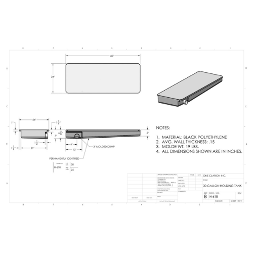 The Custom Roto-Mold 30 Gallon RV Holding Tank (Part# H-618) is engineered to meet the demands of mobile holding storage applications, including RVs, trailers, food trucks, and off-grid systems. Its slim, low-profile design is well-suited for installations in shallow compartments, under-floor mounting, or compact service areas.