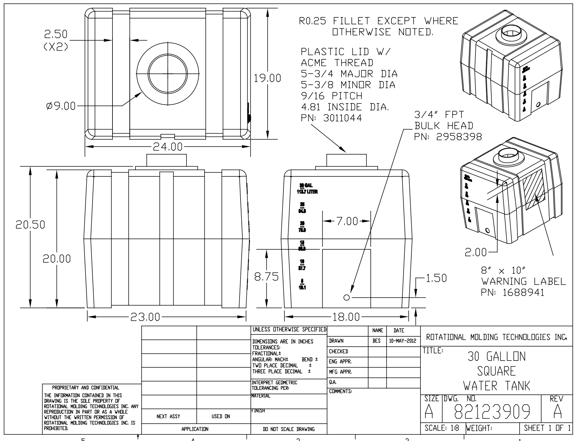 Outlet/Drain: 3/4" PP female NPT bulkhead fitting