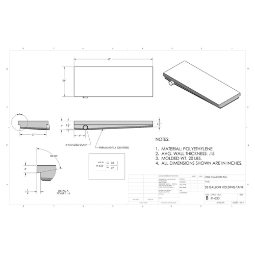 The Custom Roto-Mold 31 Gallon RV Holding Tank (Part# H-633) is engineered to meet the functional demands of mobile holding storage systems, including RVs, trailers, food trucks, campers, and off-grid living setups. With its low-profile and mid-range capacity, it is well-suited for installations with vertical clearance constraints.