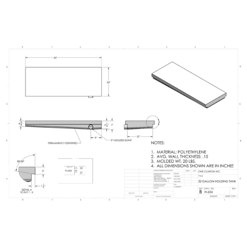 The Custom Roto-Mold 31 Gallon RV Holding Tank (Part# H-634) is engineered to meet the needs of mobile holding storage applications, including RVs, trailers, food trucks, tiny homes, and off-grid setups. With its slim profile and moderate capacity, it is ideal for spaces where vertical clearance is limited but reliable storage is essential.
