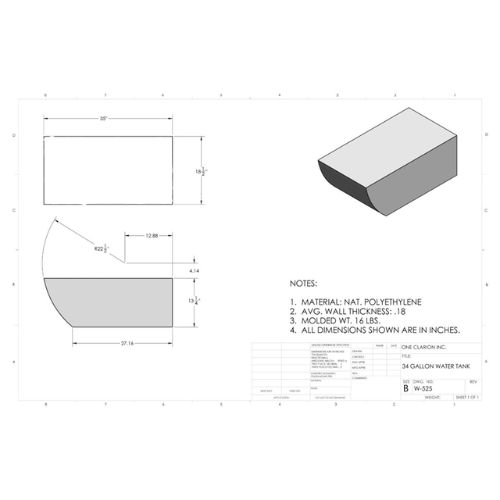 The Custom Roto-Mold 33 Gallon RV Water Tank (Part# W-525) is engineered to meet the requirements of mobile potable water storage in a wide range of compact and mobile living applications. Crafted from rotationally molded polyethylene resin, this tank delivers long-lasting durability and safe water storage performance.