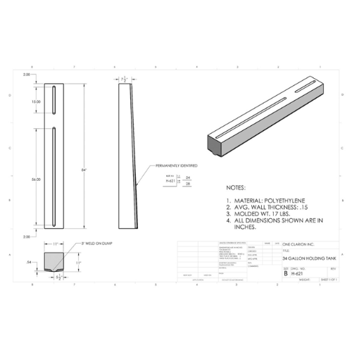 The Custom Roto-Mold 34 Gallon RV Holding Tank (Part# H-621) is engineered to meet the demands of mobile holding storage applications, including RVs, campers, trailers, food trucks, and off-grid systems. With a narrow and elongated footprint, this tank is perfect for installations that require length over width or depth, such as under chassis or alongside structural frames.