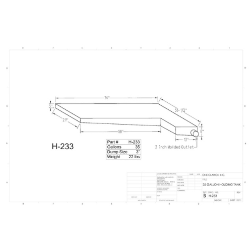 The Custom Roto-Mold 35 Gallon RV Holding Tank (Part No. H-233) is engineered for low-clearance mobile storage applications requiring a slim, wide footprint. Designed to perform in RVs, trailers, campers, and mobile specialty builds, this tank offers a 35-gallon capacity while maintaining a remarkably shallow 6-inch profile.