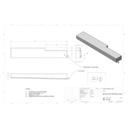 The Custom Roto-Mold 38 Gallon RV Holding Tank (Part# H-536) is designed to meet the demands of mobile liquid storage applications in RVs, campers, trailers, and portable sanitation units.