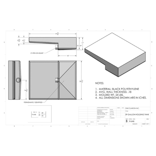 The Custom Roto-Mold 39 Gallon RV Holding Tank (Part# H-646) is engineered to meet the demands of mobile holding storage applications, including RVs, trailers, food trucks, and off-grid sanitation systems. With a broad rectangular footprint and moderate height, this tank is ideal for installations that require a balance between vertical and horizontal space.