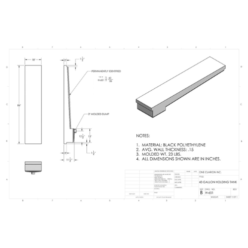 The Custom Roto-Mold 43 Gallon RV Holding Tank (Part# H-651) is engineered for reliability and longevity in RVs, trailers, food trucks, and other mobile storage applications. With its elongated low-profile design, it fits well in tight undercarriage spaces or shallow compartments.