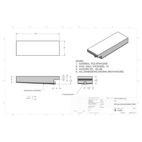 The Custom Roto-Mold 50 Gallon RV Holding Tank (Part# H-635) is designed to meet the demanding requirements of mobile holding storage systems, including RVs, trailers, food trucks, and off-grid units. With a balanced, mid-size capacity and a durable form factor, this tank is ideal for users needing reliable, long-lasting containment for water or waste.