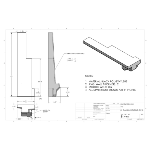 The Custom Roto-Mold 51 Gallon RV Holding Tank (Part# H-655) is engineered to meet the demands of RVs, trailers, and mobile sanitation systems requiring high-capacity holding solutions. Its long, narrow profile makes it ideal for installation in underbelly compartments or other elongated mounting areas.