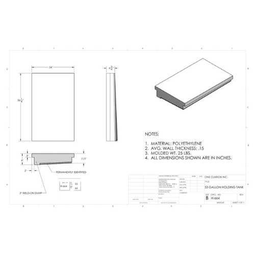 The Custom Roto-Mold 53 Gallon RV Holding Tank (Part# H-664) is engineered to meet the demands of mobile holding storage applications, including RVs, trailers, campers, food trucks, and off-grid systems. Its low-profile design and generous capacity make it ideal for installations with limited vertical clearance and high-volume waste or water storage needs.