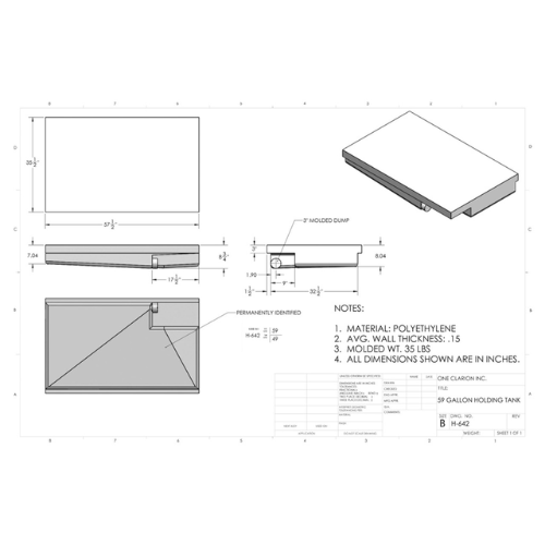 The Custom Roto-Mold 57 Gallon RV Holding Tank (Part# H-642) is built to handle the demands of mobile holding storage systems such as RVs, trailers, food trucks, campers, and off-grid installations. With a wide and shallow profile, this tank is ideal for underfloor mounting or areas with limited vertical clearance but ample horizontal space.