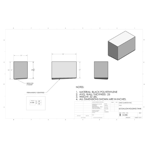 The Custom Roto-Mold 62 Gallon RV Holding Tank (Part# H-598) is designed to meet the rigorous demands of mobile holding storage applications, including RVs, trailers, food trucks, and off-grid water systems.