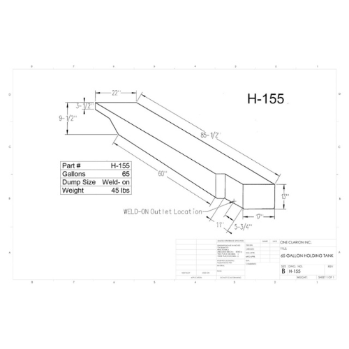 The Custom Roto-Mold 65 Gallon RV Holding Tank (Part No. H-155(OR)) is purpose-built to meet the demanding needs of mobile water and waste containment. With a slim and extended footprint, this tank is ideal for undercarriage installations in RVs, food trucks, trailers, or marine applications where space efficiency and volume are equally important.