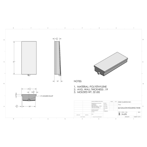 The Custom Roto-Mold 66 Gallon RV Holding Tank (Part# H-678) is engineered to meet the demands of mobile holding storage applications, including RVs, trailers, campers, food trucks, and off-grid systems. Its balanced rectangular footprint offers generous capacity while still accommodating mid-sized installation areas.