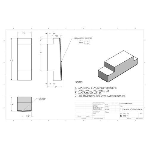 The Custom Roto-Mold 71 Gallon RV Holding Tank (Part# H-614) is engineered to meet the demands of mobile holding storage applications including RVs, trailers, food trucks, and off-grid systems. Its high-capacity design is ideal for extended trips and larger sanitation systems.