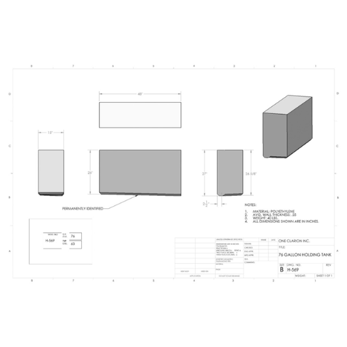 The Custom Roto-Mold 76 Gallon RV Holding Tank (Part# H-569) is engineered to meet the requirements of mobile liquid storage applications in RVs, campers, trailers, and mobile sanitation systems.