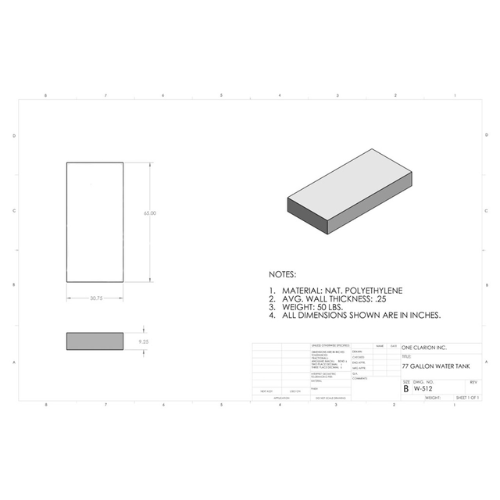 The Custom Roto-Mold 77 Gallon RV Water Tank (Part# W-512) is engineered to meet the requirements of mobile water storage applications. Manufactured from rotationally molded polyethylene resin, this tank is made for potable water use.