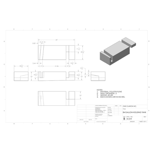The Custom Roto-Mold 84 Gallon RV Holding Tank (Part# H-519) is engineered to meet the performance standards required for mobile liquid storage in RVs, trailers, campers, and portable sanitation systems.