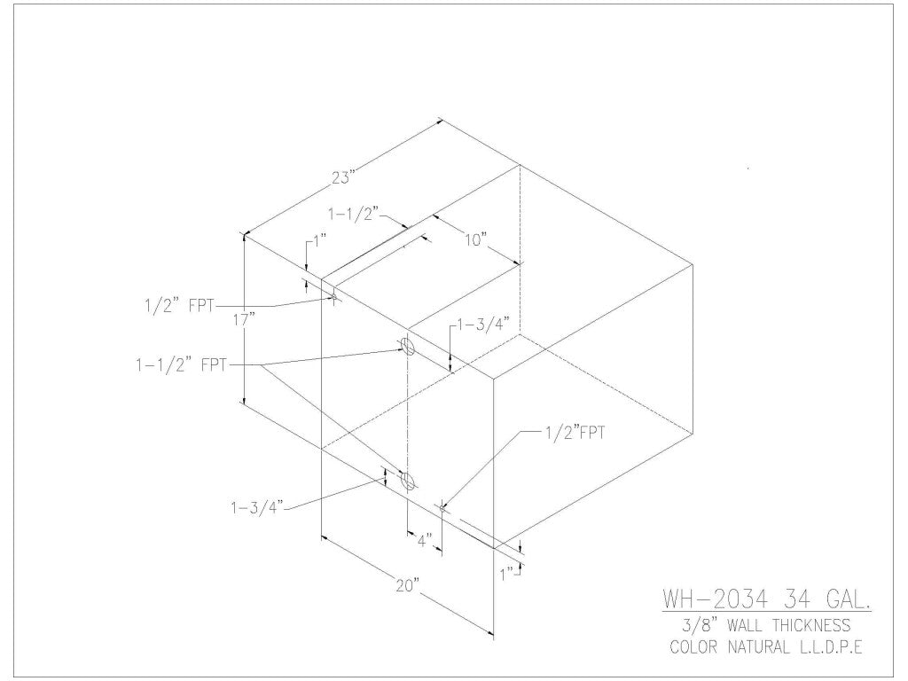 With Hole tanks has (2) 1-1/2″ FPT and (2) 1/2″ FPT threaded openings. Openings on all tanks feature female National Pipe Threads (NPT) and are located on one end of the tank. Unused openings can be capped.