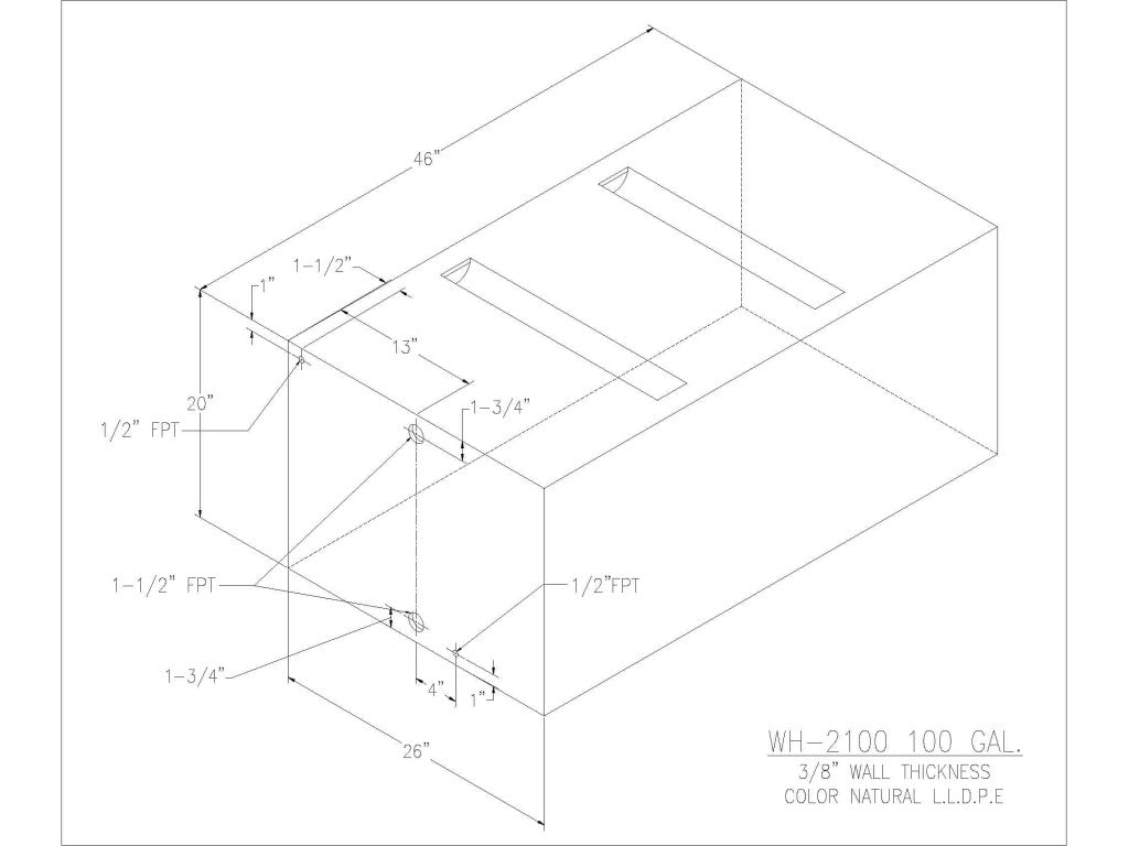 With Hole tanks has (2) 1-1/2″ FPT and (2) 1/2″ FPT threaded openings. Openings on all tanks feature female National Pipe Threads (NPT) and are located on one end of the tank. Unused openings can be capped.