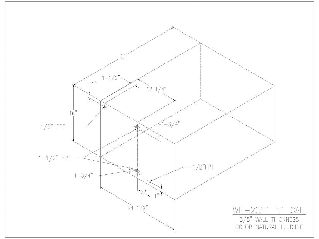 With Hole tanks has (2) 1-1/2″ FPT and (2) 1/2″ FPT threaded openings. Openings on all tanks feature female National Pipe Threads (NPT) and are located on one end of the tank. Unused openings can be capped.
